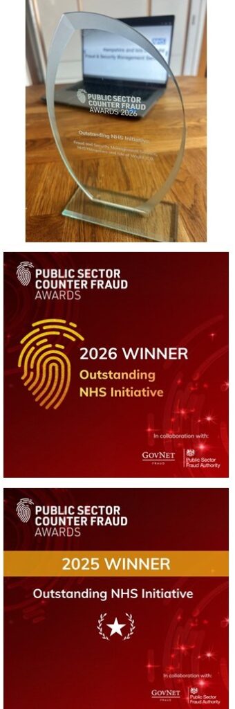 For the third consecutive year, the Fraud and Security Management Service are shortlisted as finalists for the ‘Outstanding NHS Initiative’ Award at the upcoming Public Sector Counter Fraud Awards, to be held in London in February 2026.